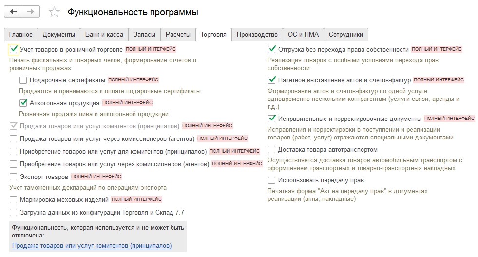 Раздел программного обеспечения 1С 8.3, который обеспечивает активацию необходимого пользователю функционала, называется «Функциональные опции». К примеру, можно вести учет по нескольким организациям или настроить несколько хранилищ для хранения информации. В таком случае на интерфейсе во время выбора документа будет предоставлен выбор между «Организации» и «Склады». В противном случае программа будет вести учет только по одной организации или одному складу.