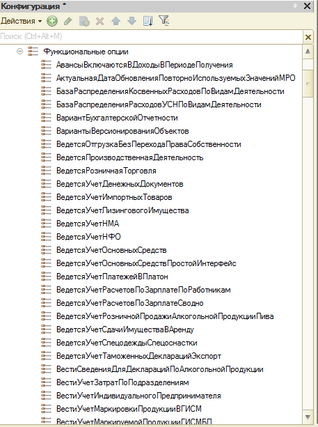 Пользователю откроется большой список, который содержит функциональные опции, имеющиеся в программном обеспечении 1С.