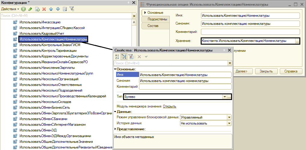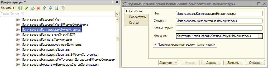 На примере функциональной опции «ИспользоватьКомплектациюНоменклатуры» рассмотрим основные параметры. Чтобы открыть ее, необходимо нажать по ней двойным щелчком мыши. Будет представлено новое окно, где следует проверить поле «Хранение», в котором указывается объект, связанный с активацией или выключением функциональной опции. В нашем случае это константа, которая является типом «Булево». Ниже будет стоять галочка «Привилегированный режим», что свидетельствует о доступной в привилегированном режиме опции.