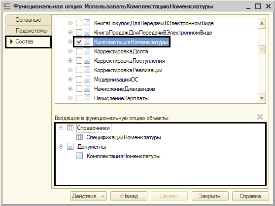 Перейдя в закладку «Состав», можно определить список объектов, которые доступны во время активации опции. В данном случае доступным является «Спецификация номенклатуры» и «Комплектация номенклатуры».
