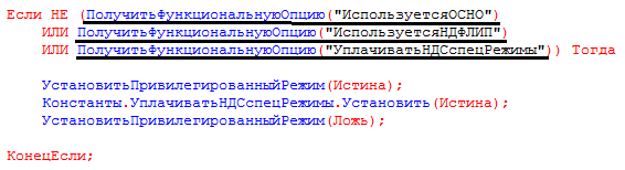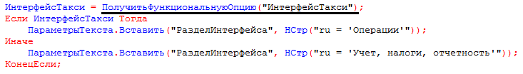 Для управления доступностью кода применяется метод ПолучитьФункциональнуюОпцию(), пример которого представлен ниже: