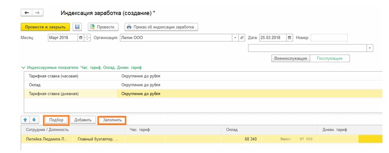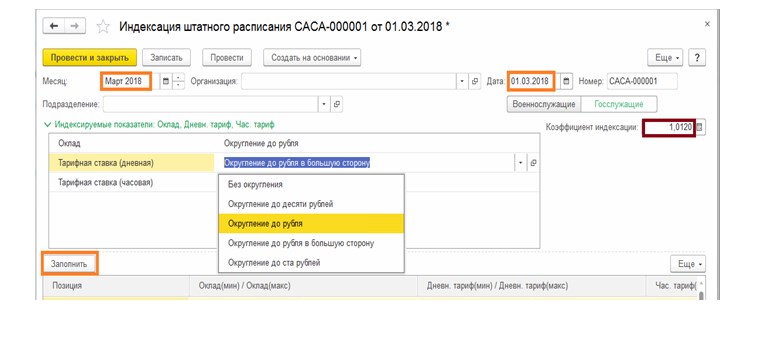 Когда заполняется документ Индексация штатного расписания, то главное не забыть про заполнение данных о: