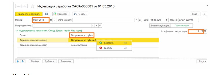 Здесь заполняем те же показатели: месяц, с которого начинается отсчет, показатели для индексации, а также коэффициенты.  При оформлении видов начислений, которые умножаются на коэффициент, можно воспользоваться функцией округления.