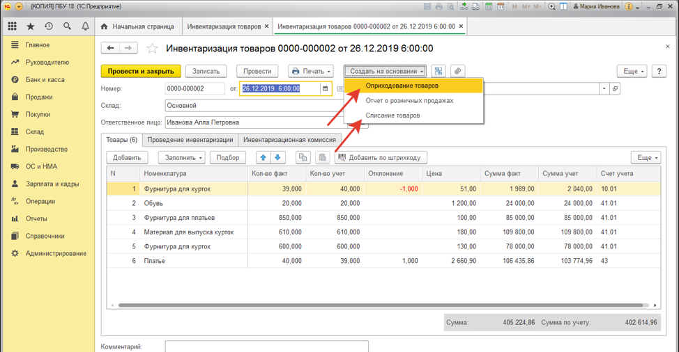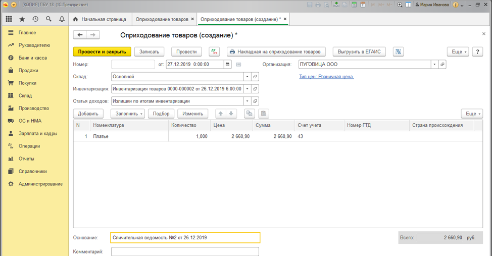 Эти два документа можно заполнить в автоматическом режиме. За основание берутся данные из «Инвентаризации товаров». Для этого нажмите «Создать на основании».