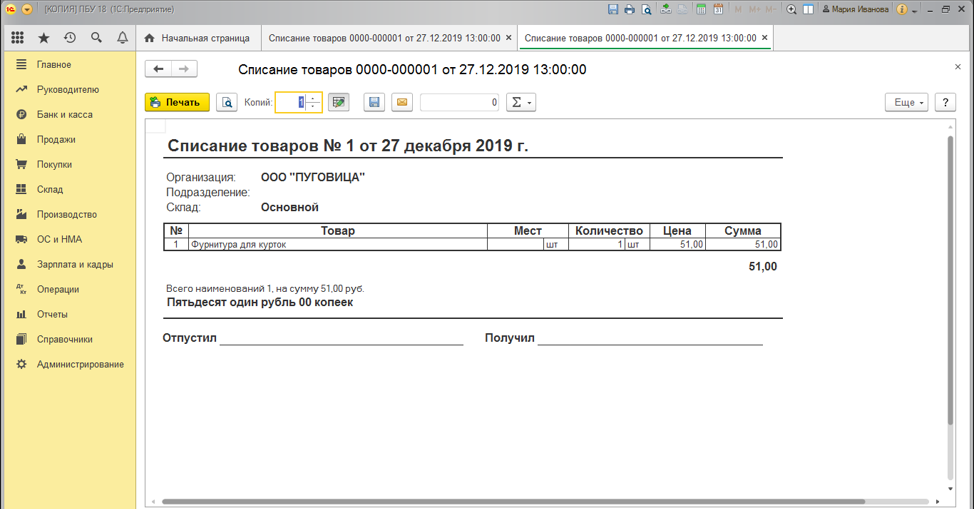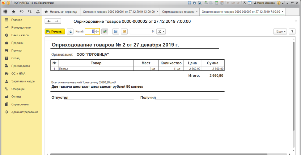 Все документы можно распечатать при желании. А при создании «Оприходования товаров» вы даже сможете распечатать накладную: