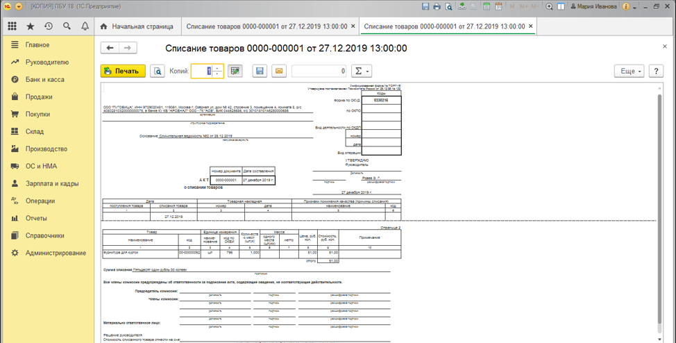 В документе «Списание товаров» есть возможность перевести на бумагу акт на списание товаров по форме ТОРГ-16.