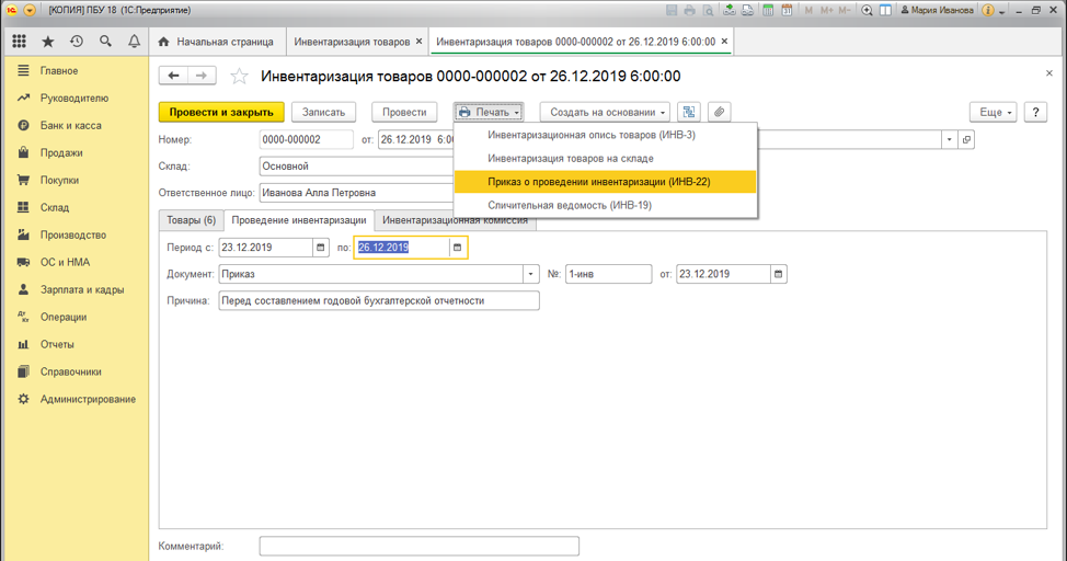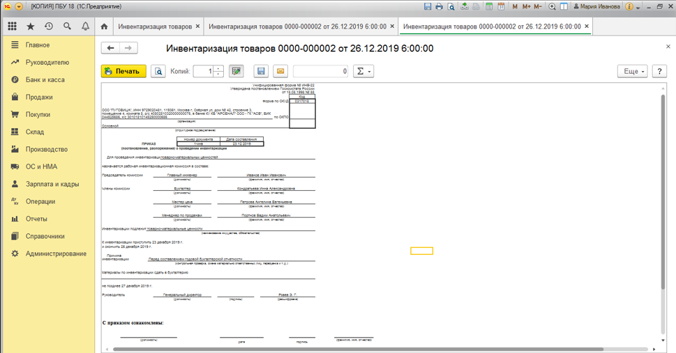 Ни одна процедура инвентаризации не происходит сама по себе. Она имеет документальную подоплеку. Перед тем, как ее проводить, создается приказ. Вы можете распечатать готовый приказ, но перед этим вам нужно внимательно заполнить вкладки «Проведение инвентаризации», а также — «Инвентаризационная комиссия».