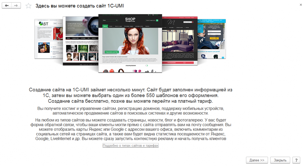 Раздел меню «Создать сайт» позволяет создать торговую площадку. Для создания портала используется платформа 1С-UMI. Сам процесс является совершенно бесплатным, но также предусмотрена плата за расширение возможностей.