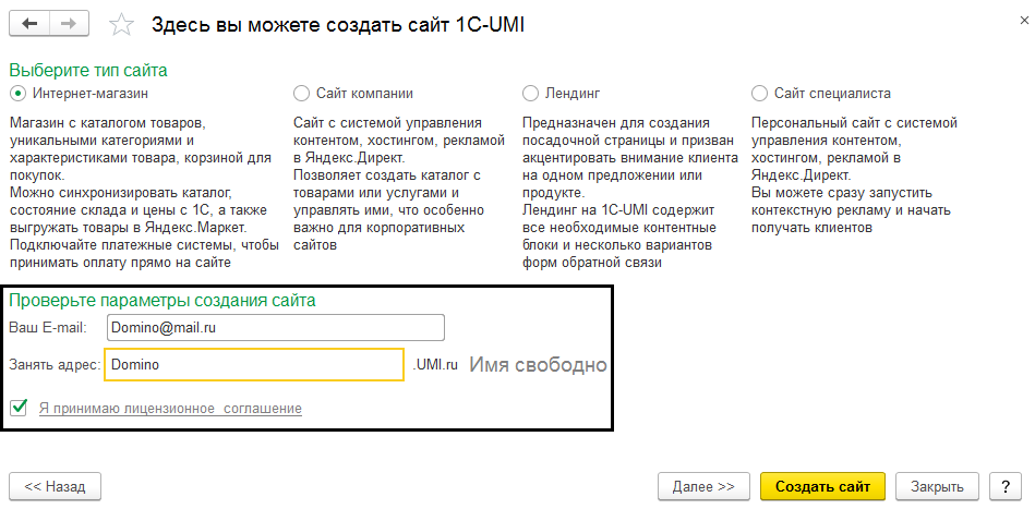 Процесс разработки интернет-портала заключается в изначальном выборе сайта и ввода своих данных (желаемый интернет-адрес, электронная почта, показ уведомлений и заказы клиентов). Предоставляемый процесс будет продемонстрирован на примере интернет-магазина. Когда указывается адрес, система сообщается о занятости данного места. После удачной проверки необходимо поставить галочку рядом с «Я принимаю лицензионное соглашение». Останется только выбрать «Создать сайт».