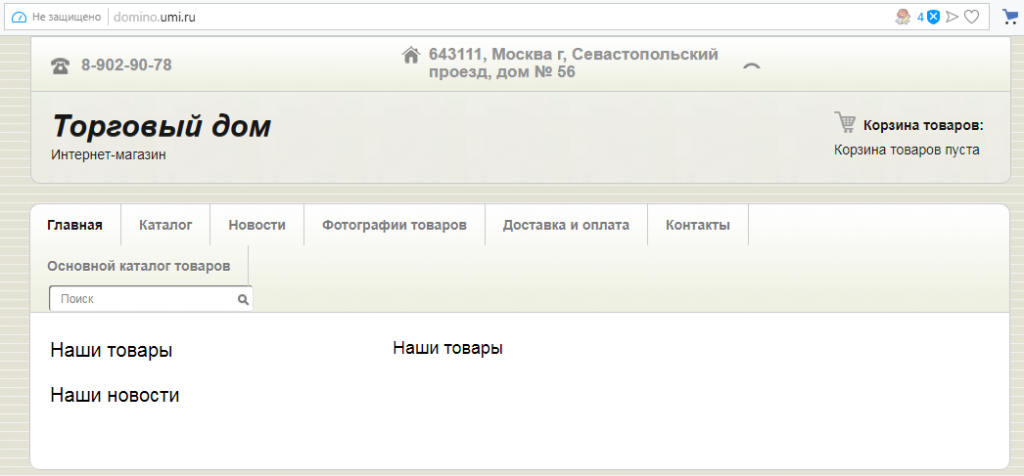 Когда создание сайта было завершено, новоиспеченный портал откроется в браузере. Адрес сайта был указан domino и в браузерной строке к нему добавлено UMI. Таковым является условие лицензионного соглашения. Платный режим создания позволит компании использовать собственный домен. Сайт создается по шаблону. Внешнее оформление можно будет изменить в дальнейшем. Для товаров будет выделено место «Каталог».