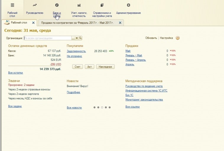 Панель действий. Здесь вы можете использовать дополнительные окна, которые расположены под основным меню. Откроется нужная полезная информация, стандартные отчеты и возможность обратиться в техподдержку.