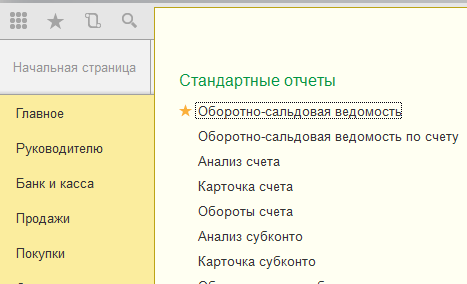 Обычно какие-то разделы или отчеты бухгалтер использует ежедневно. Например, ОСВ или ОСВ по счету. Чтобы они всегда были под рукой, добавьте их в «Избранное». Для этого в разделе «Отчеты» находим оборотно-сальдовую ведомость. Наведите на нее указатель мыши, а затем нажмите на серую звездочку. Так вы добавите отчет в «Избранное», что в дальнейшем сделает вашу работу удобнее.