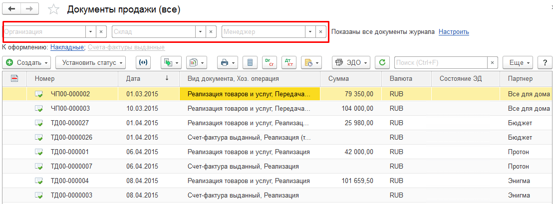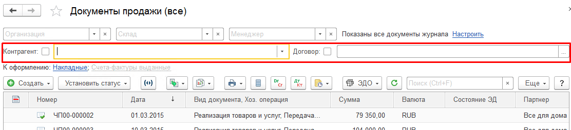 Для поисков документов в системе имеются поля отборов. Они помогут вам отбирать документы в перечне по реквизиту. По умолчанию имеются такие поля: