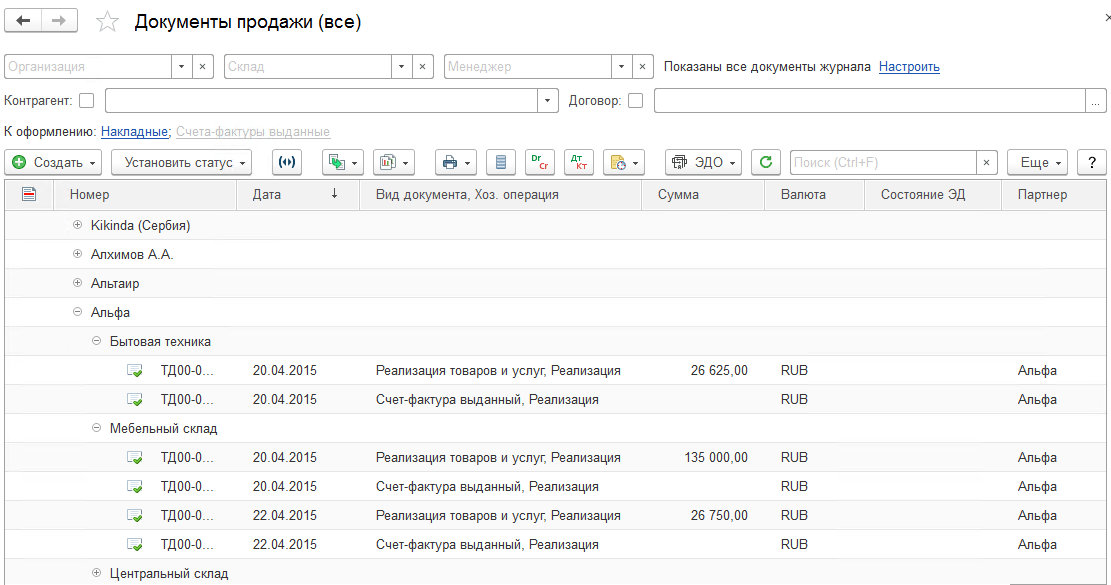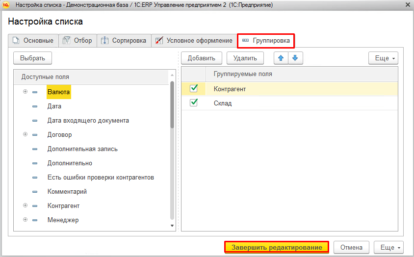 На вкладке «Группировка» осуществляется группировка сведений, представленных в перечне по значению определенного поля. К примеру, у вас получится сгруппировать документы по контрагенту, а далее - по складу. И произвести команду «Завершить редактирование».