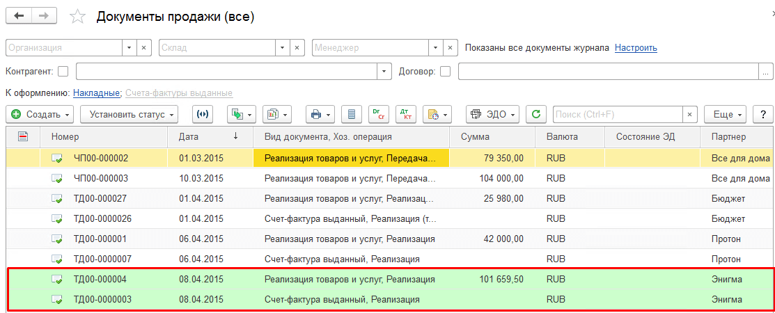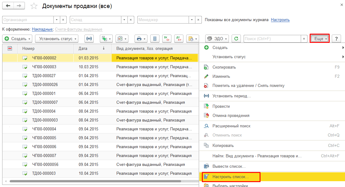Чтобы облегчить пользователю взаимодействие с документами, поиском, изменением вида справочника, в 1С существует механизм настройки. Рассмотрим его на примере конфигурации «1С:ERP Управление предприятием 2» при работе со списком «Документы продажи».