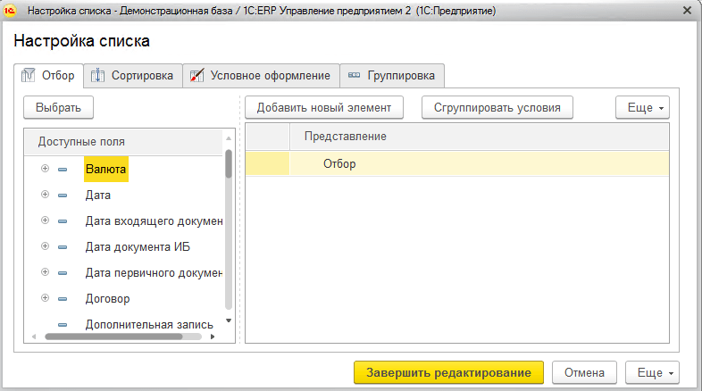 В окне «Настройка списка» в подразделе «Отбор» находится перечень доступных полей. Чтобы выбрать поле отбора, пользователю потребуется выбрать нужное из перечня и нажать клавишу «Завершить редактирование».