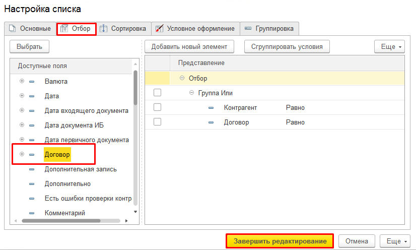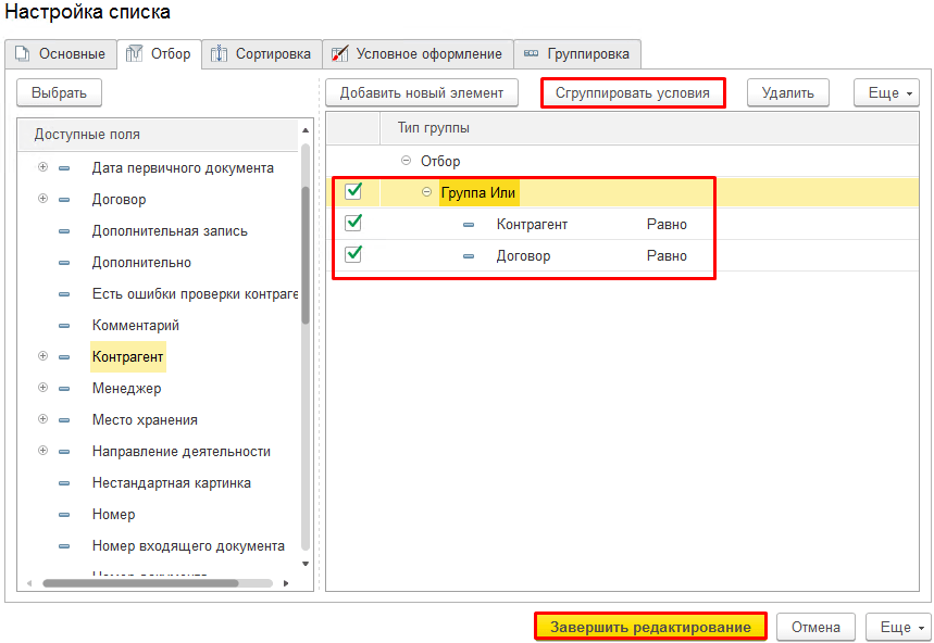 При необходимости отбор с легкостью осуществляется по нескольким полям, с указанием условия. Для этого пользователь должен нажать клавишу «Сгруппировать условия» и указать необходимое условие, которое потребуется для группировки указанных полей: «И», «Или», «Не». После этого нужно нажать «Завершить редактирование».