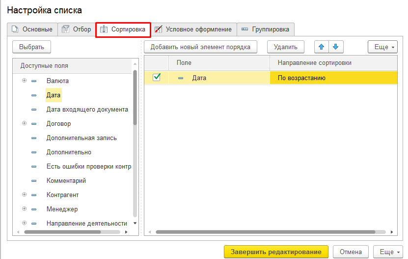 На вкладке «Сортировка» у вас получится настроить произвольную сортировку сведений, отображаемых в перечне. К примеру, можно настроить сортировку по возрастанию или по убыванию даты.