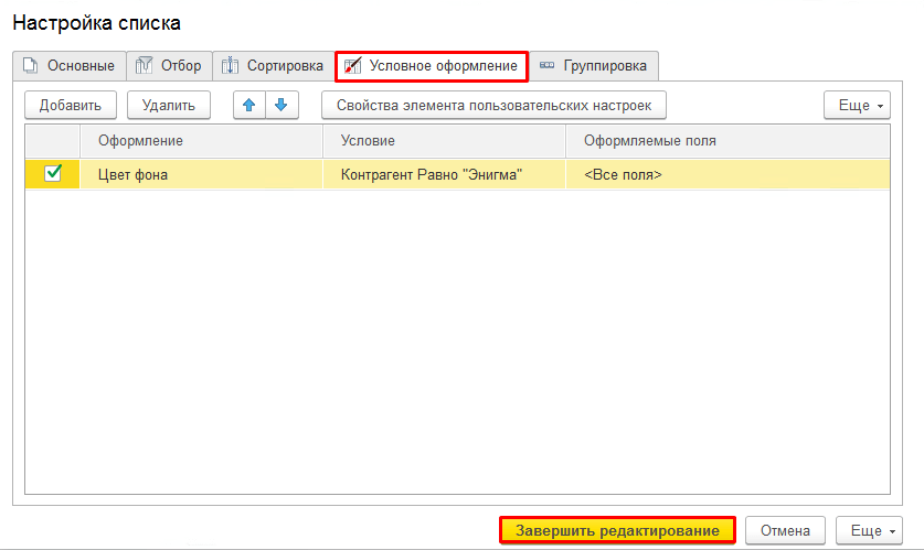 Во вкладке «Условное форматирование» у пользователя появится возможность настроить оформление справочника по определенным сведениям. К примеру, документы по контрагенту «Энигма» будут выделены цветом. Также можно настроить выделение отрицательной информации, отображение шрифта, доступность и видимость компонентов в справочнике.