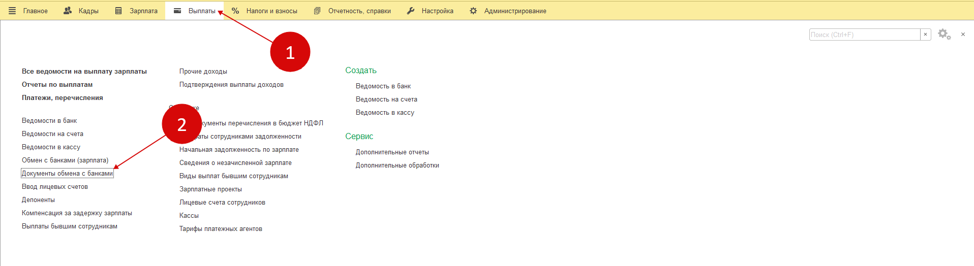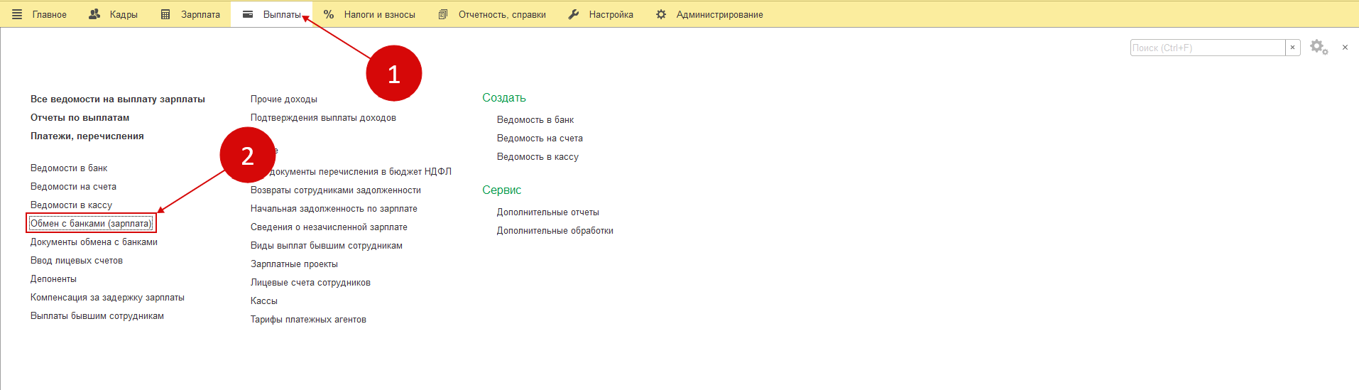 - Выберите раздел «Выплата» (1), затем нажмите «Обмен с банками (зарплата)» (2).