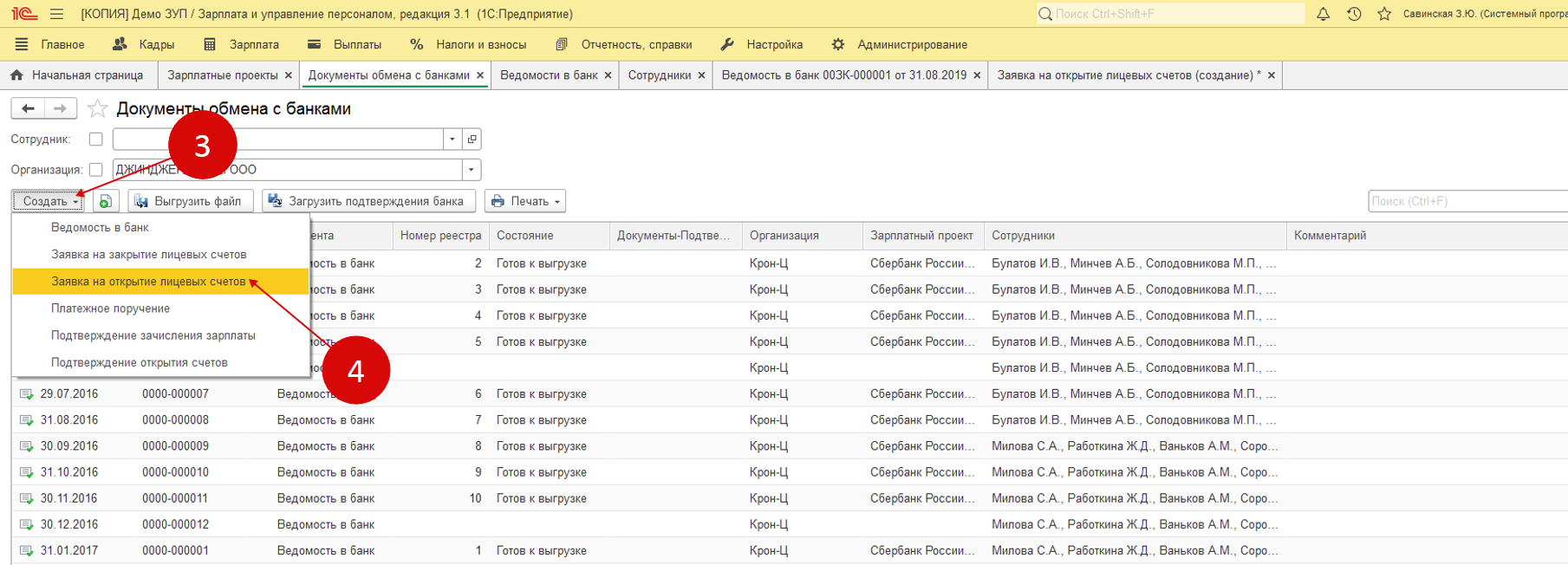 - В появившемся окне выберите зарплатный проект и организацию (3).