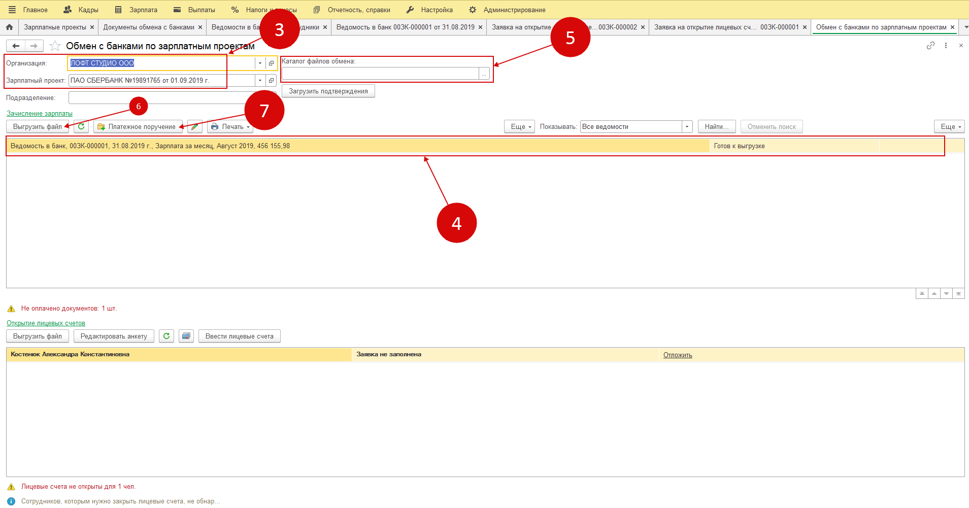 - В нижней части окна отобразятся зарплатные ведомости, сформированные для выгрузки в банк (4).