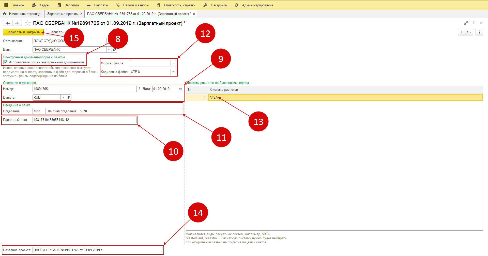 Сохранить внесенные изменения в новый зарплатный проект в 1С 8.3 ЗУП можно нажав кнопку «Записать и закрыть» (15). После того как настройки сохранены, ведомость на выплату зарплаты можно отправлять в банк одним файлом. Подробнее, о том, как это сделать в следующем разделе.