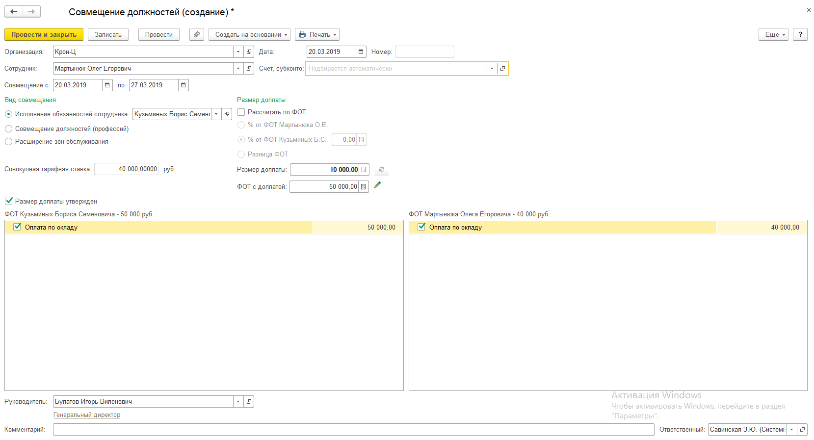Если на предприятии планируется совмещение, нужно вводить одноименный документ по кнопке «Создать на основании». Он нужен для официального назначения дополнительной оплаты работнику, который возьмет на себя должностные обязанности коллеги, ушедшего в отпуск. Основные реквизиты здесь уже добавлены. Пользователю потребуется лишь указать данные совмещающего сотрудника и сумму доплаты. После выполнения всех перечисленных операций документ можно проводить.