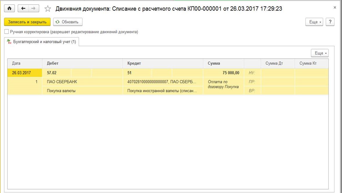 В момент покупки валюты банк выполнит списание необходимой для этого суммы со счета организации-покупателя. Оформление этой операции в 1С: