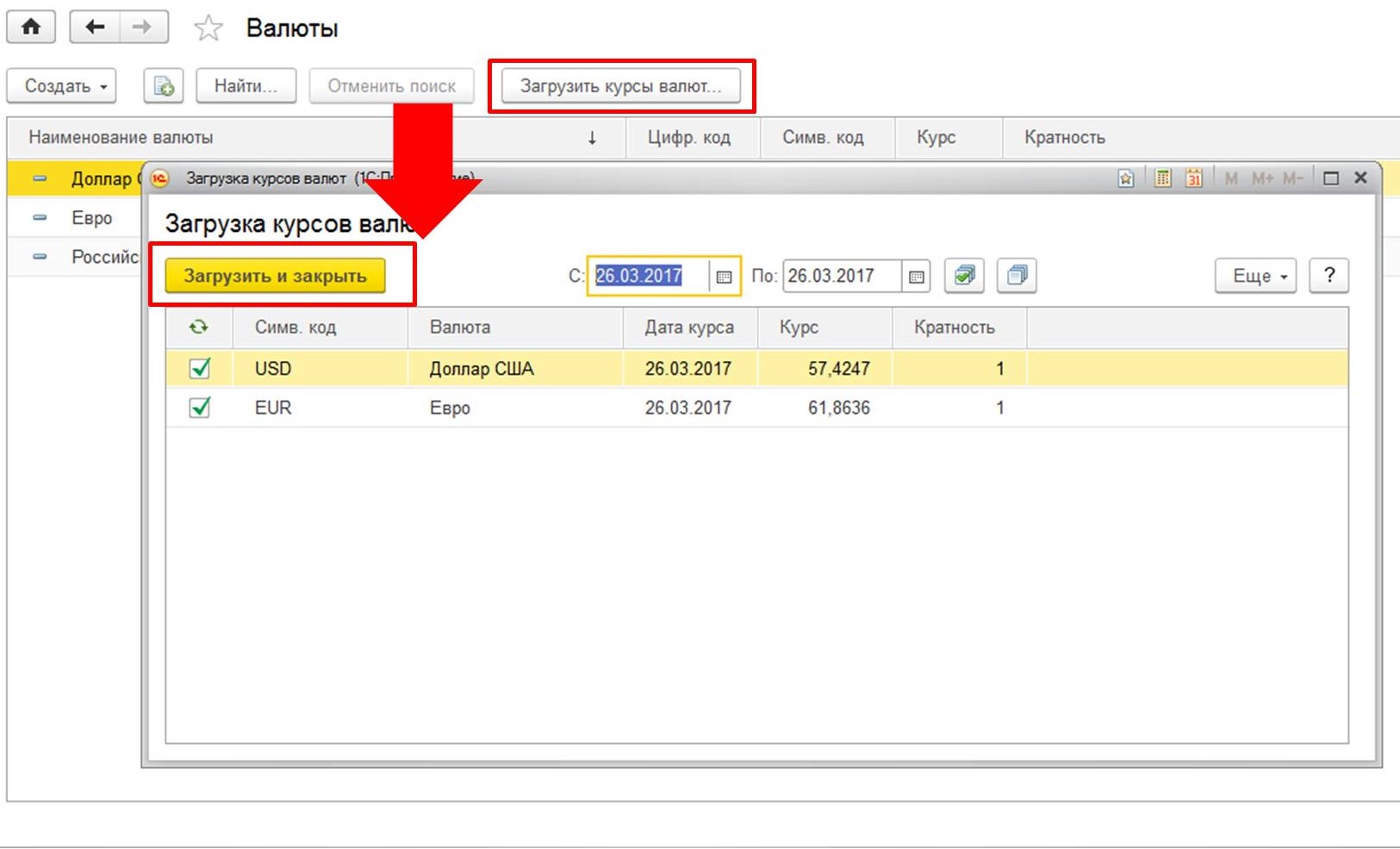 По факту списания, банк выполнит наше поручение по закупке. Поскольку бухгалтерия обязана хранить валюту только в рублевом эквиваленте, бухгалтерская программа производит требуемые перерасчеты. Необходимые для этого данные импортируются из программного справочника «Курсы валют», информацию в котором требуется регулярно обновлять. Для этих целей предусмотрена возможность загрузки действующего в данный момент курса Центрального Банка из сети: