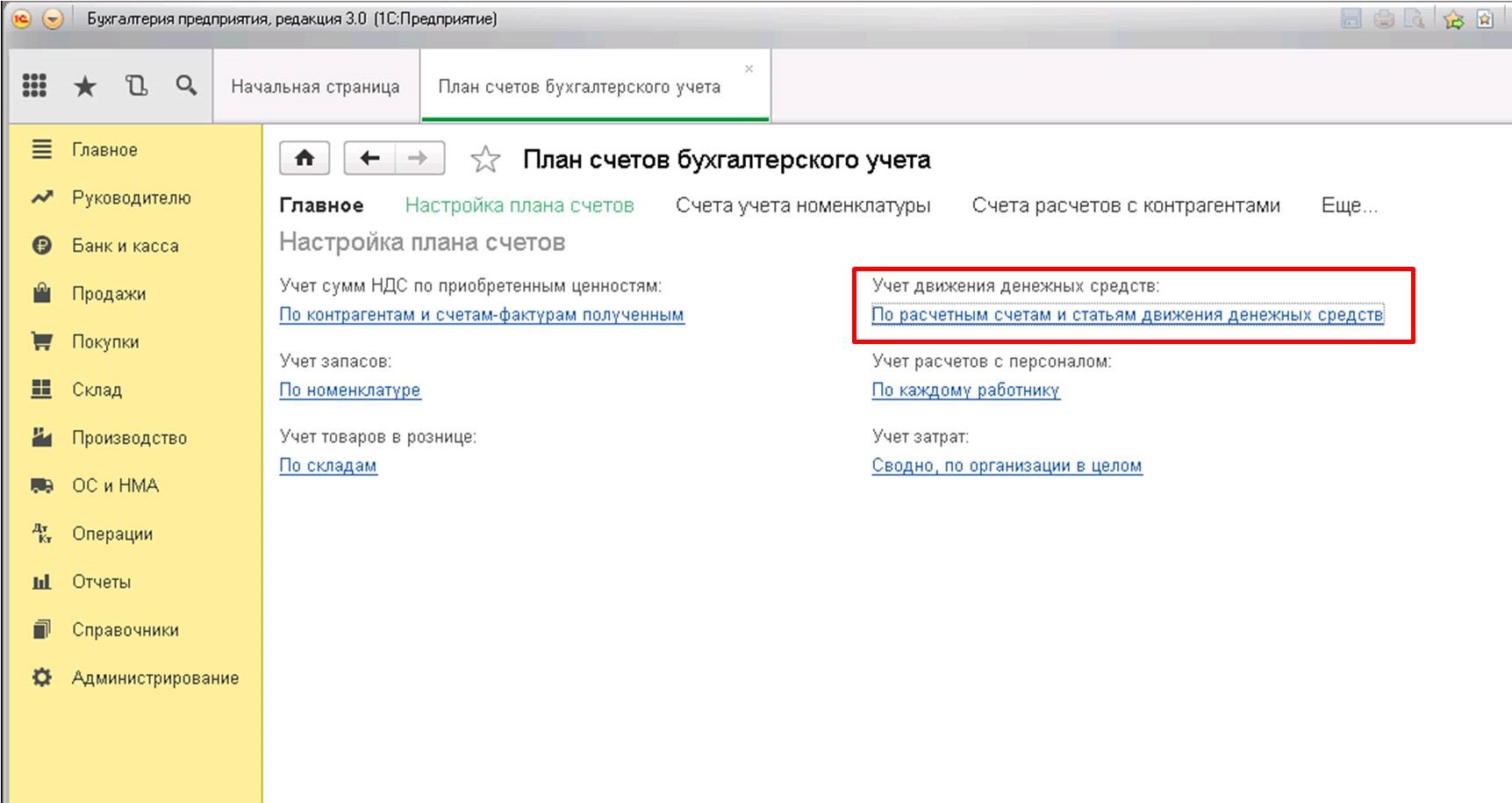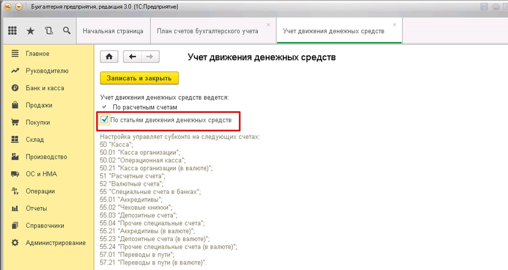 Если флажок отсутствует, его необходимо поставить. Включение этой функции разрешает ведение учета в аналитическом ключе: «Статьи движения денежных средств». После того, как флажок установлен, информация об этом (субконто) отобразится на всех счетах учета: