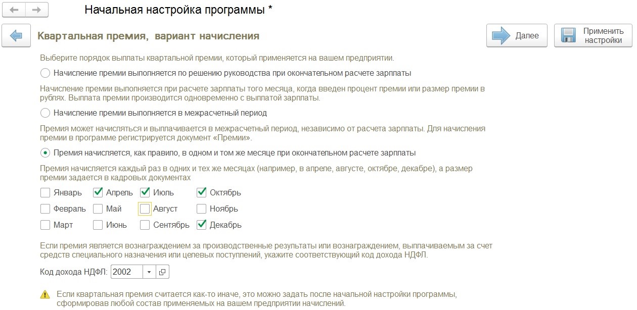 Квартальную премию можно начислять, когда введен процент премии, при итоговом вычислении зарплаты; премию можно посчитать документом «Премии» и выплачивать в середине месяца; премию можно начислять как постоянное начисление в заранее заданных месяцах. Эти настройки задаются далее в окне помощника.