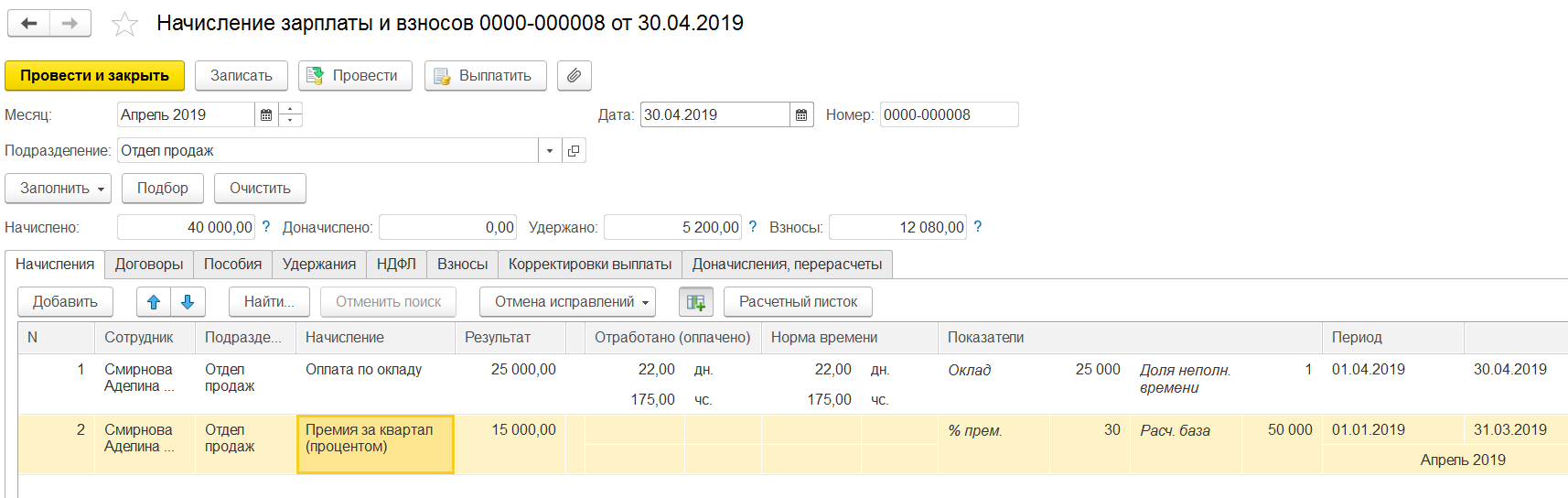 Заполним документ «Начисление зарплаты» за апрель. Автоматом подтянется премия за квартал.