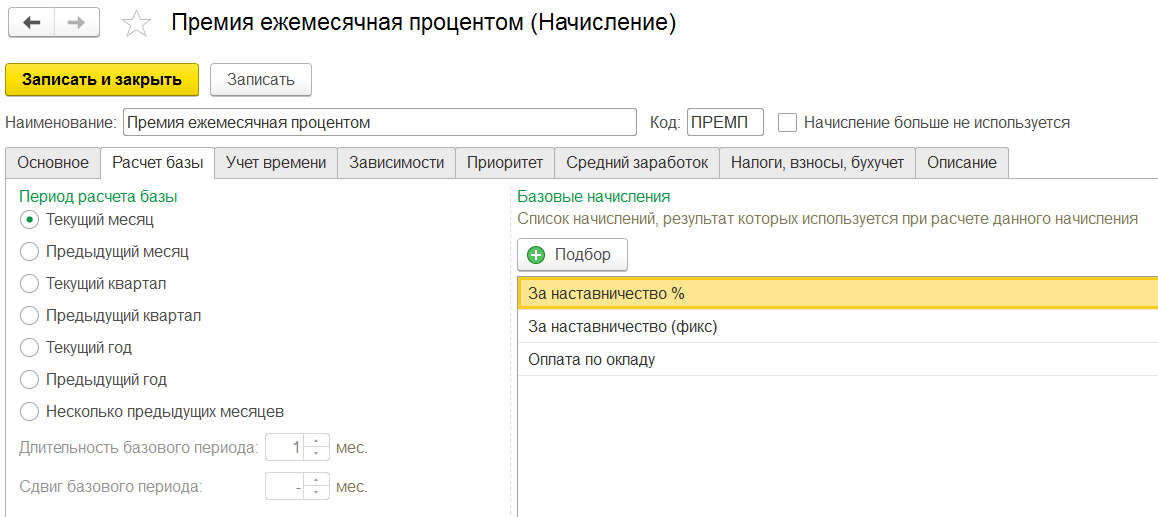 В расчете базы давайте выберем интервал вычисления «текущий месяц». Когда мы будем рассчитывать заработную плату за январь 2019, период расчета премии будет также январь 2019.