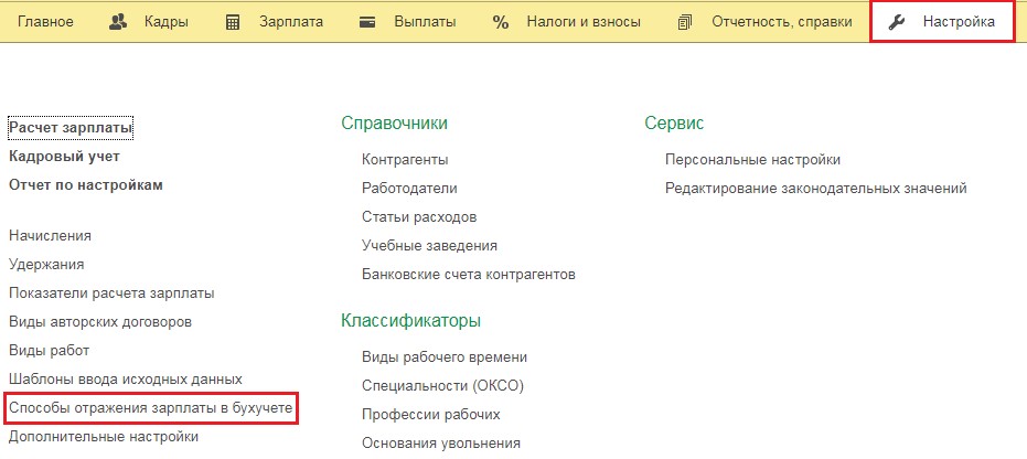 Но пока что о нынешней: чтобы оформить в 1С: ЗУП 3.1, что при начислении заработной платы была использована субсидия, нужно начать с раздела «Настройка». В нём найдите подраздел «Способ отражения зарплаты в бухучёте», нажмите на его название.