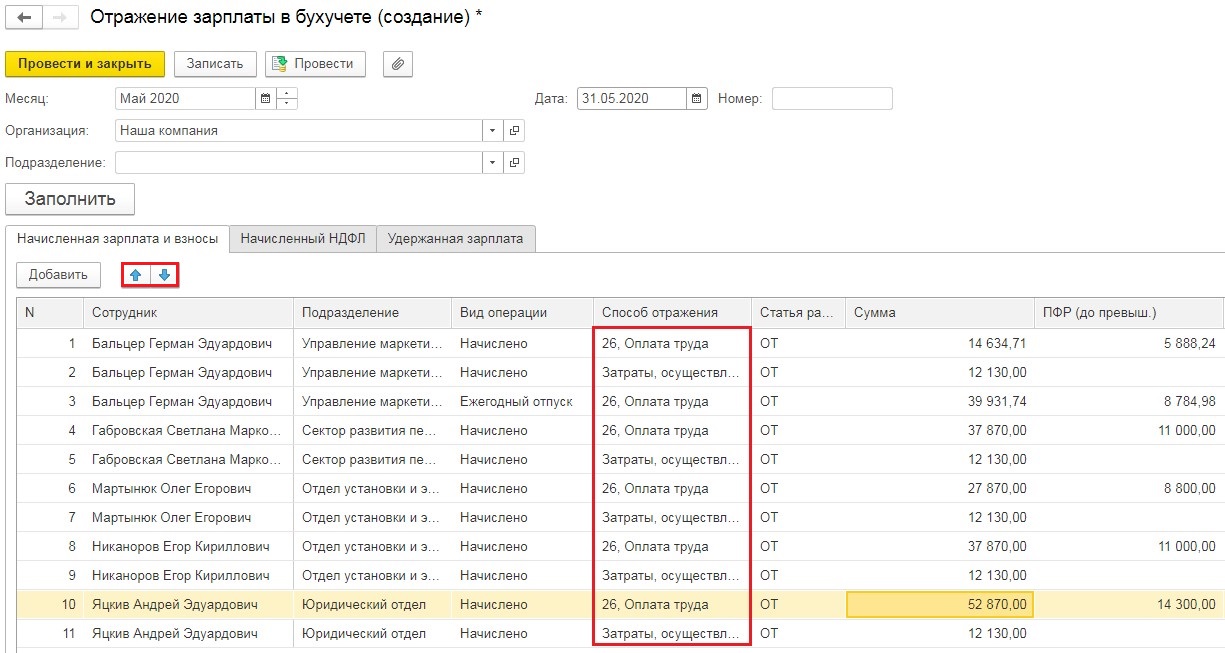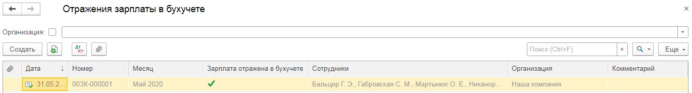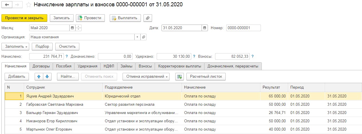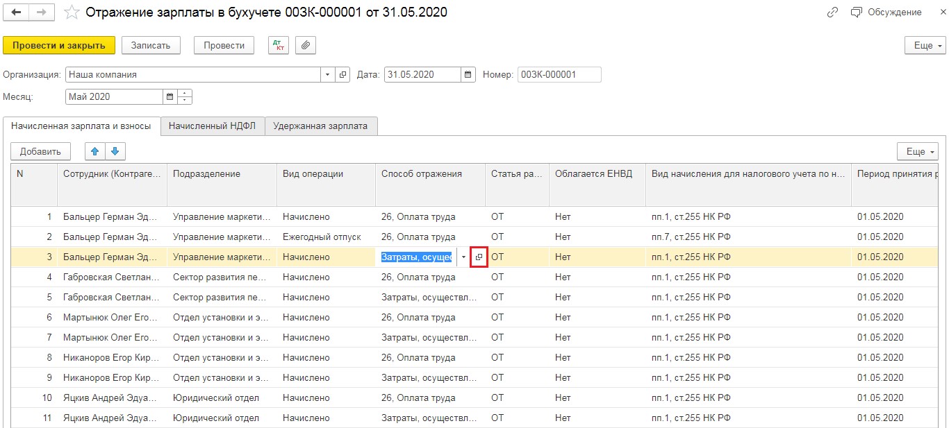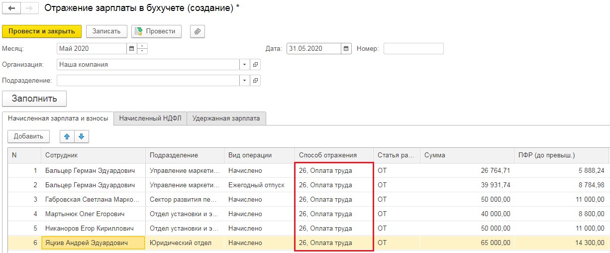 Когда изменения будут внесены, проведите и проверьте проводку по документу «Отражение зарплаты в бухучёте»: