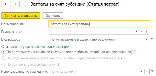 Нажмите на кнопку «Создать» и введите наименование нового способа: «Затраты, осуществлённые за счёт субсидии». Сохраните его, воспользовавшись кнопкой «Записать и закрыть».