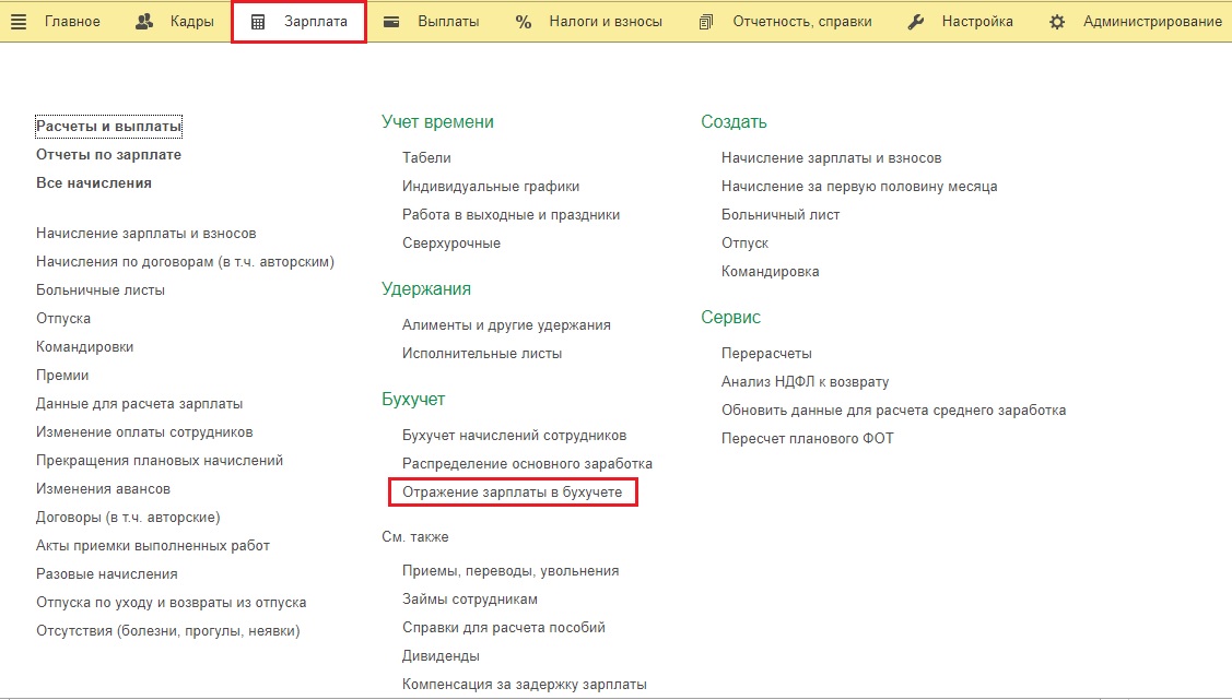 Следующий шаг – распределение зарплаты по счетам бухучёта. Чтобы его провести, отправьтесь в раздел «Зарплата» и найдите в нём пункт «Отражение зарплаты в бухгалтерском учёте».