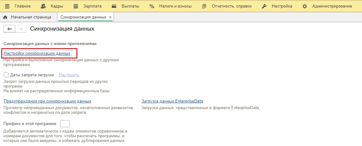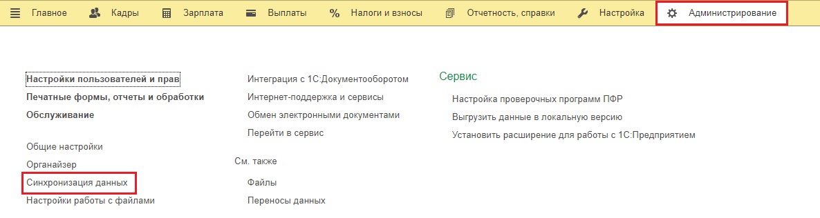 Для этого необходимо настроить обмен между программами. Проведение настройки – отдельная, достаточно обширная тема. Если всё уже настроено, отправьтесь в раздел «Администрирование», а в нём в подраздел «Синхронизация данных».