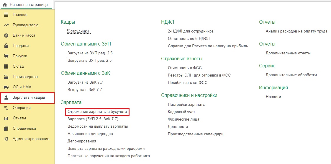 На всякий случай нужно проверить, отражены ли изменения в 1С: Бухгалтерия предприятия. Чтобы сделать это, отправьтесь в раздел «Зарплата и кадры» и найдите там «Отражения зарплаты в бухучёте», как показано на рисунке: