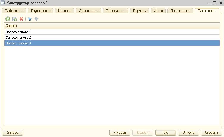 Пакет запросов требуется пользователю в тех случаях, когда появляется необходимость в получении нескольких выборок данных за одно обращение к базе или во время работы с временными таблицами. Это особенный вид таблиц с информацией, которые конструируются 1С в период выполнения запроса. В случае их использования они станут доступными в будущих обращениях в дереве конфигурации в первом разделе конструктора.