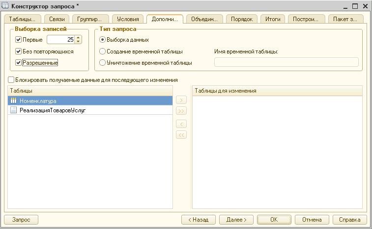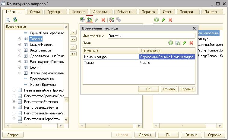 Пользователь способен создавать временные таблицы с помощью конструктора и самостоятельно. Вкладка «Таблицы и поля» содержит клавишу формирования описания временной таблицы в среднем окне. Чаще всего данной опцией пользуются в целях передачи таблиц в запрос извне. Рядом располагается клавиша формирования вложенного запроса. Результат этого запроса к базе данных можно использовать в дальнейших операциях.