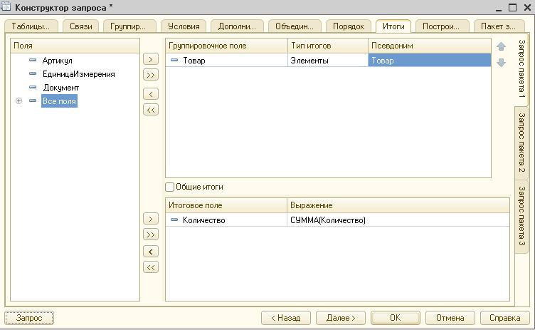 У конструктора есть еще одна опция, но используется она сравнительно редко. Это вывод итогов. В разделе «Итоги» пользователь задает необходимые ему арифметические расчеты с числовыми полями. В текстовом виде эта настройка отображается в виде оператора «Итоги по».