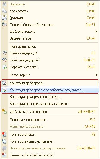 Воспользоваться конструктором 1С можно в специальных обработках или конфигураторе. Специальные обработки – это консоли запросов, позволяющие сохранить конфигурацию на поддержке. Для запуска конструктора потребуется однократный клик правой клавишей мыши в поле для создания кода или в модулях. Затем необходимо выбрать из списка нужный пункт.