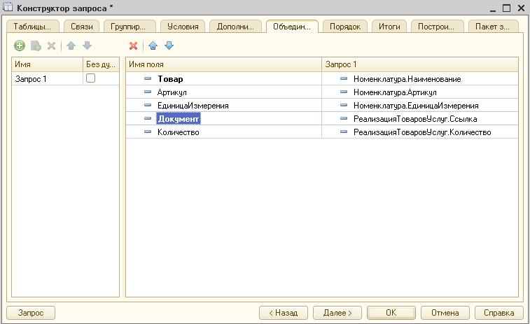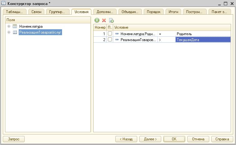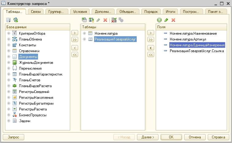 «Таблицы и поля». Это стартовая вкладка, где отражена вся информация о задействованных полях и таблицах в запросе. В левой части находится общее дерево конфигурации, в правой – конечные поля, а в центре расположены источники информации для выборки. Здесь должна быть заложена основа запроса из секций «выбрать из».