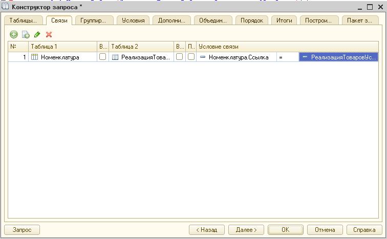 «Связи». В этом разделе содержится информация о выбранных таблицах, а также поля, по которым они соединены. Нередко 1С предлагает собственные варианты связей, основываясь на похожих типах данных, но опытные программисты предпочитают их изменять. В тексте запроса информация из этой вкладки формируется в конструкцию «Соединение».