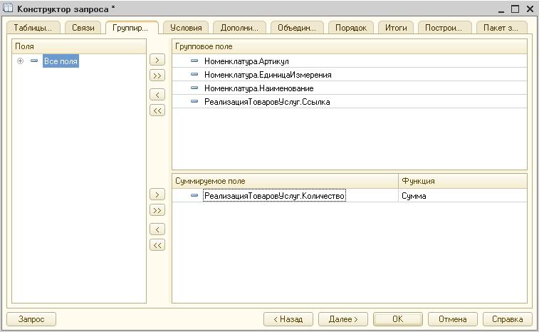 «Группировка». В этом разделе строки группируются по определенным полям, а с числовыми реквизитами проводятся простые арифметические операции. В тексте запроса данные расположены в разделе «Сгруппировать по».