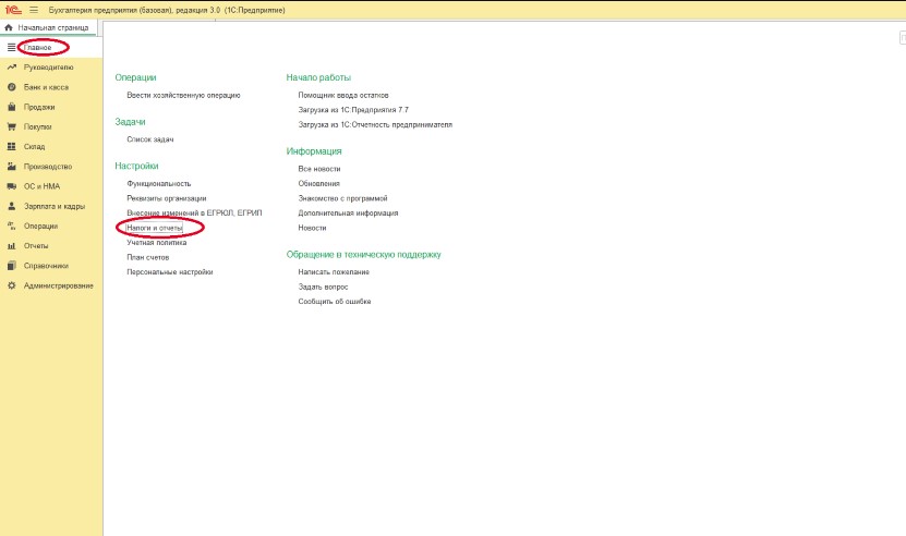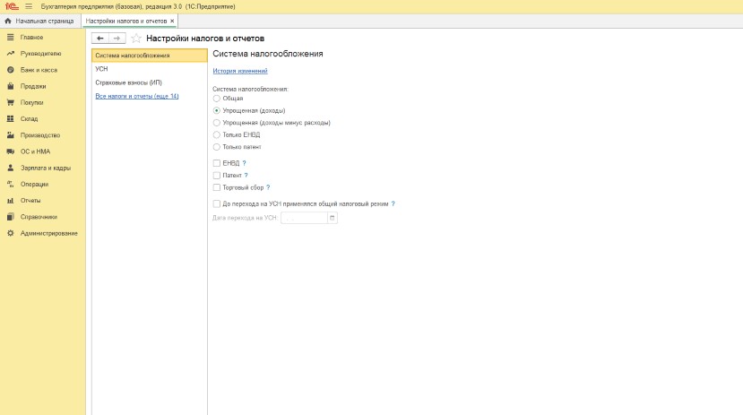 Чтобы изменить настройки режима налогообложения, перейдите в меню Главное, подраздел Настройки — Налоги и отчеты: