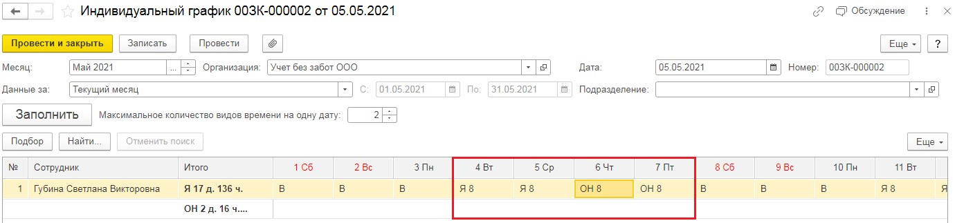 В сформированном графике следует щёлкнуть на кнопку «Подбор» и указать требуемого работника, или заполнить по подразделению, если все работники относятся к одному отделу. Далее изменить буквы "ОН" на букву "Я" в тех днях, когда работники должны выйти на работу. Допустим наш работник Гурина Елена Викторовна должна выйти на работу и 04.05 и 05.05.