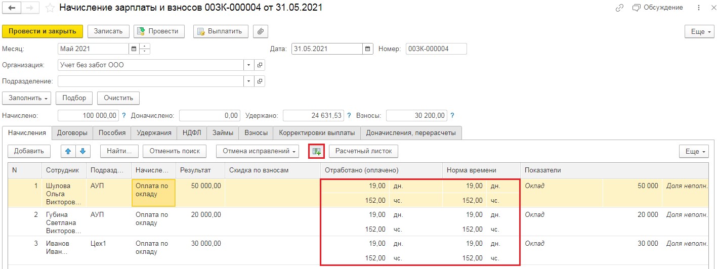 В документе "Начисление зарплаты и взносов" было указано количество дней и часов в соответствии с нормами трудового времени текущего месяца.